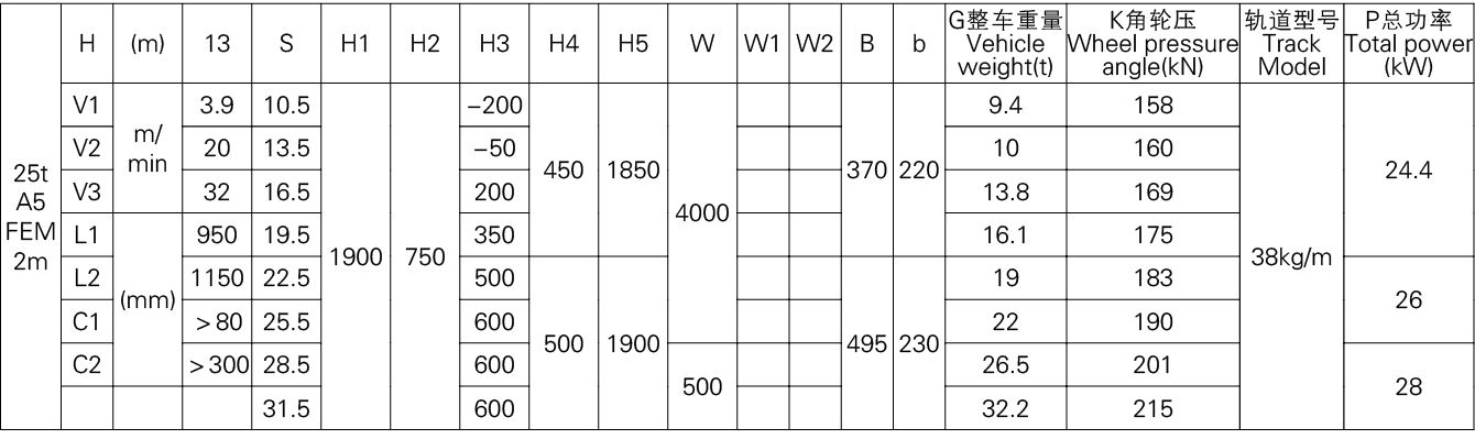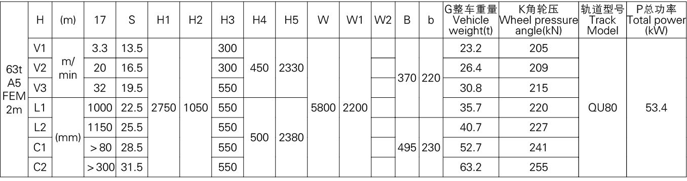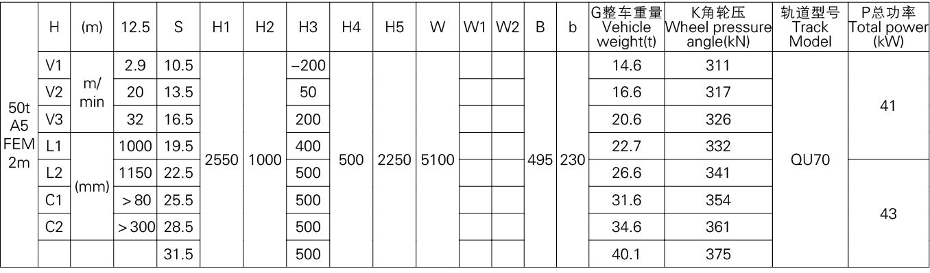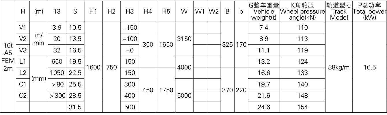 1、本产品系列表仅列出了常用的基本的规格起重机,工作级别为A5(FEM 2m)时的标准跨度,没有副钩的室内用起重机。客户根据需要可以提出相应的要求。