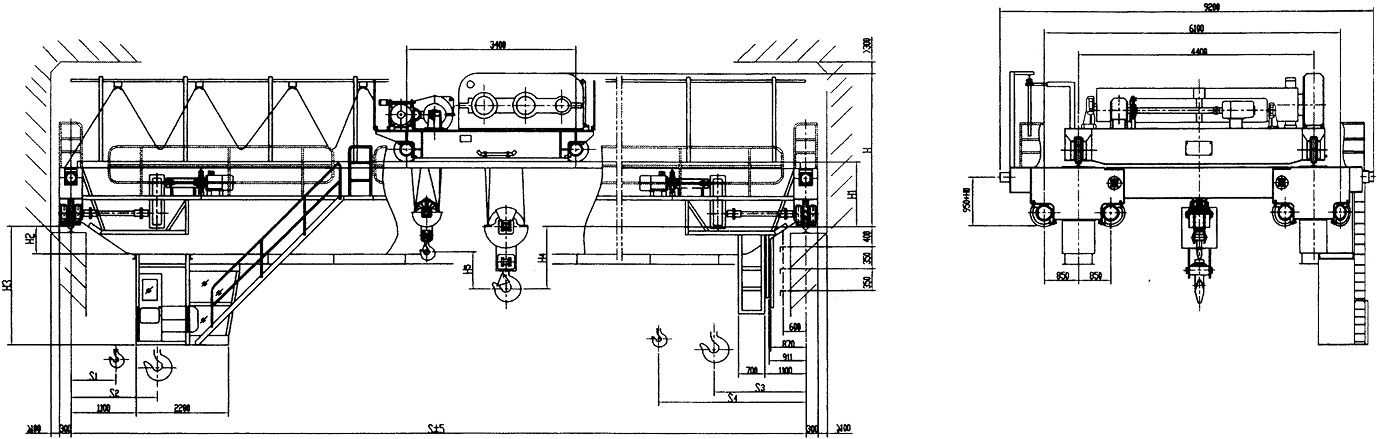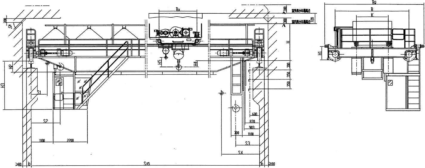 QDY吊钩桥式铸造起重机主要用于吊运熔融金属的冶金、铸造等场所,整机工作级别为A7,在主梁底部加设隔热层装置。起重机装配与试验符合国家质量监督检验检疫总局所发的质检办特[2007]375号文件。其它吊运熔融的非金属物料和吊运炽热固态金属的场所也可参照选用。(注:以下图中H0为大车缓冲器增加的高度。H0≤250)